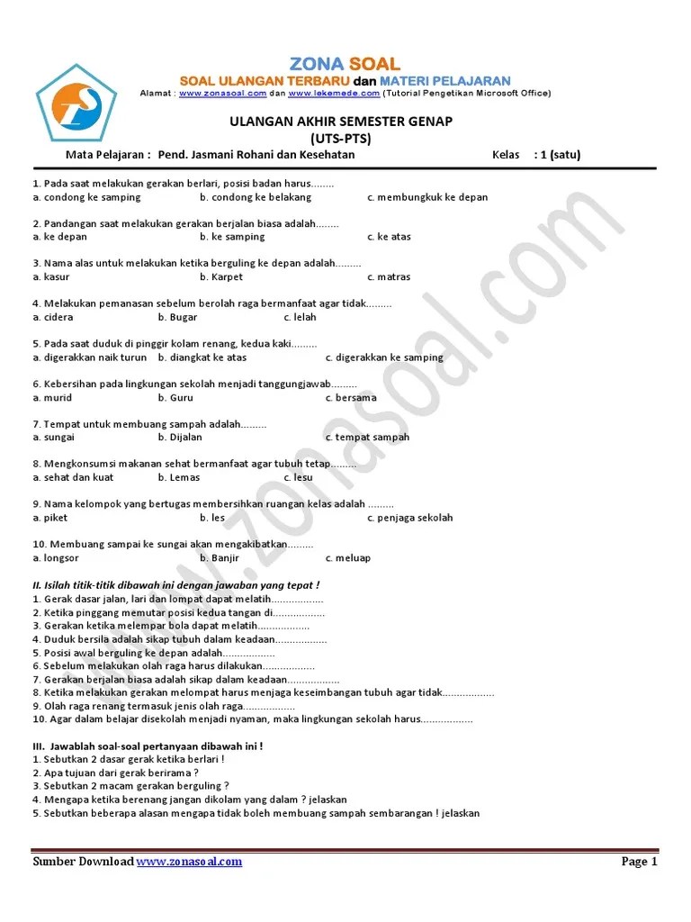 Contoh soal penjas kelas 1 sd semester 1 dan semester 2 kurikulum.
